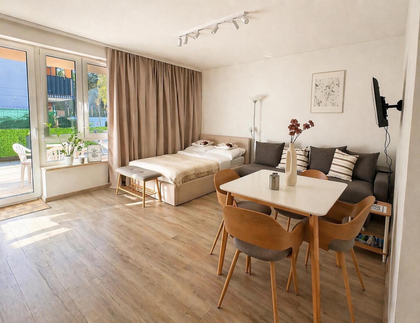 Apartament z balkonem. The air-conditioned apartment has 1 bedroom and 1 bathroom with a walk-in shower and a hairdryer. Guests can make meals in the kitchen that features a stovetop, a refrigerator, a dishwasher and kitchenware. This apartment features a washing machine, soundproof walls, a flat-screen TV with streaming services and a terrace. The unit has 2 beds. Apartament - 3 osobowy. Powierzchnia pokoju ok.: 26 mkw. ;