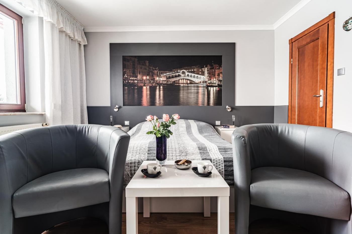 Pokój Rodzinny z balkonem (2 osoby dorosłe + 2 dzieci). This family room is comprised of a flat-screen TV with cable channels, a private bathroom as well as a terrace with a quiet street view. The unit has 3 beds. Rodzinny - 4 osobowy. Powierzchnia pokoju ok.: 20 mkw.